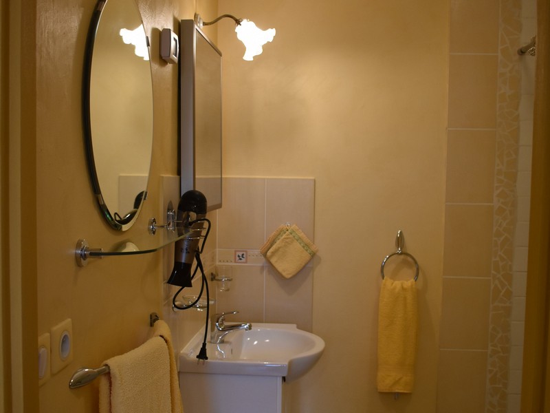 La salle de bain est équipée d'une douche à l'Italienne, d'un WC et d'un lavabo.